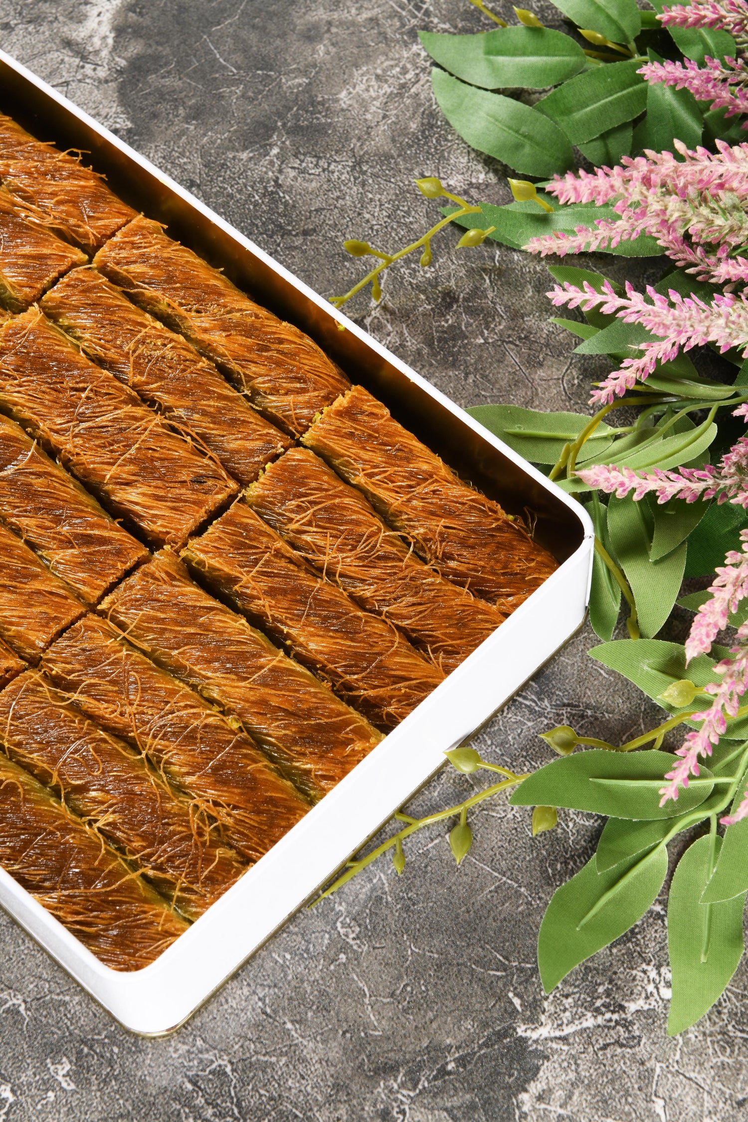 피스타치오는 섬세하게 와이어 카다이프 안에 자리 잡고 있으며, 안tep 부르마 카다이프의 정교한 형태를 형성하기 위해 세심하게 부어집니다. 가자안텝에 독특한 이 특별한 부르마 카다이프는 즐거운 롤로 능숙하게 감싸서 만들어집니다.