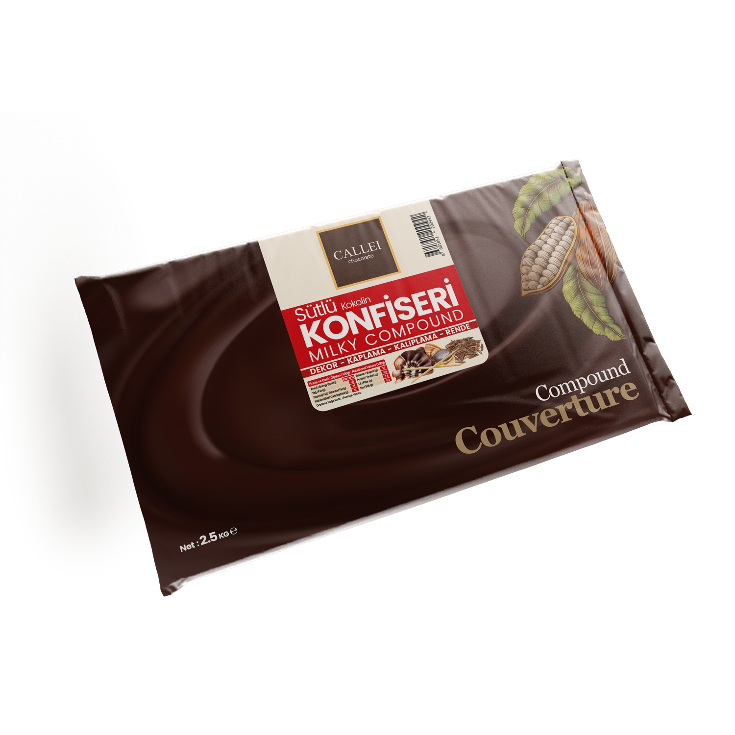 인기 제과의 초석인 Callei의 **Milky Chocolate Compound**는 고성능 2.5kg 포맷으로 고전적인 밀크 초콜릿의 보편적으로 사랑받는 편안한 맛을 전달합니다. B2B 사용을 위해 설계되어 모든 몰딩 및 인로빙 요구에 대해 일관된 품질과 효율적인 가공을 보장합니다.