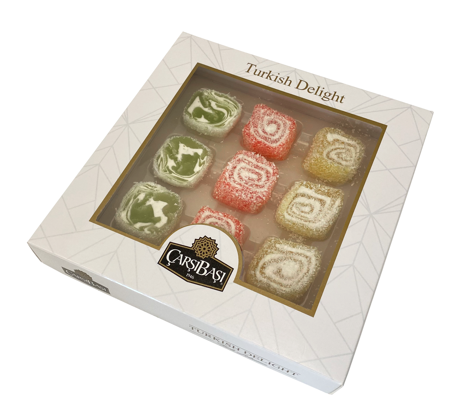 고전적인 과자에 생기 있고 현대적인 변화를 선사하세요. 이 300g Carsibasi 창문 상자에는 다양한 과일 맛이 가득한 아름다운 크림 충전 'Sarma'(롤드) 터키 딜라이트 9개가 들어 있습니다.