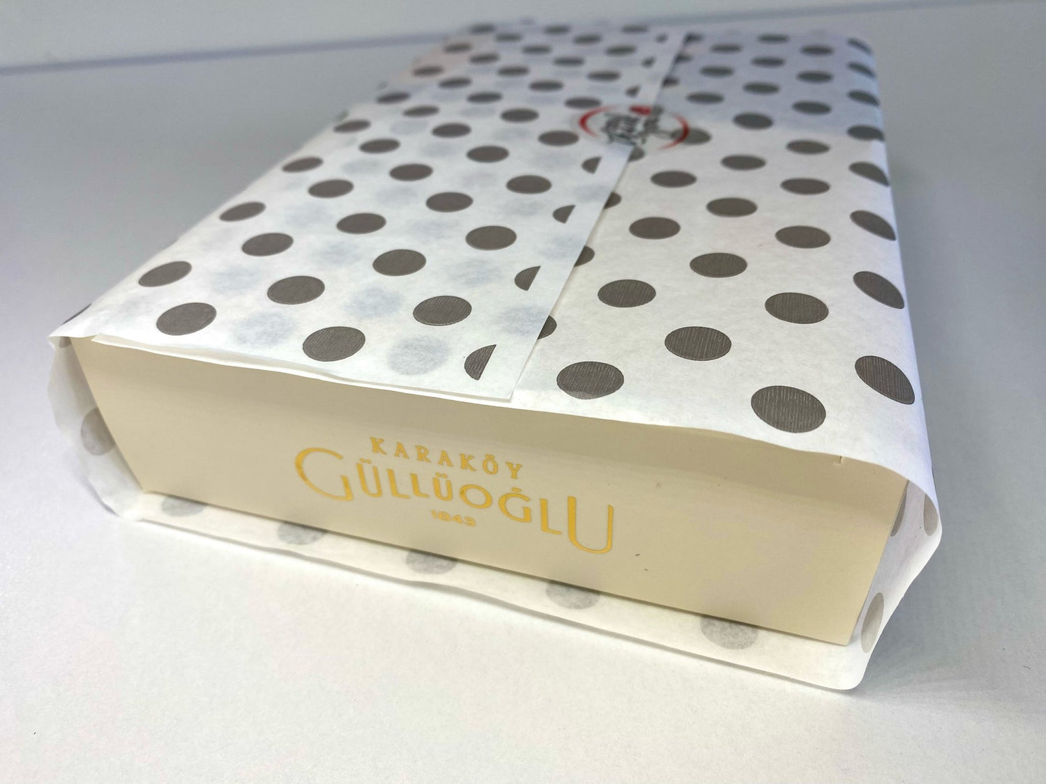 Karakoy Gulluoglu presents their delicious rendition of Pistachio Paste baklava. It's hand made using finely ground pistachio, powdered sugar, water, and then blended to create the perfect texture before being cooked. Pistachio Pate is often enjoyed with cake, confectioneries, or even by itself with a cup of coffee or tea. Whatever your preference is, get ready for your taste buds to enter a blissful awakening with this sweet, nutty dessert.
